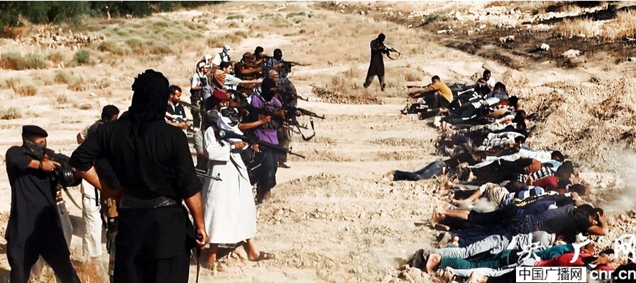 An image uploaded on June 14, 2014 on the jihadist website Welayat Salahuddin allegedly shows militants of the Islamic State of Iraq and the Levant (ISIL) executing dozens of captured Iraqi security forces members at an unknown location in the Salaheddin province. A major offensive spearheaded by ISIL but also involving supporters of executed dictator Saddam Hussein has overrun all of one province and chunks of three others since it was launched on June 9. [Photo/Cnr.cn]