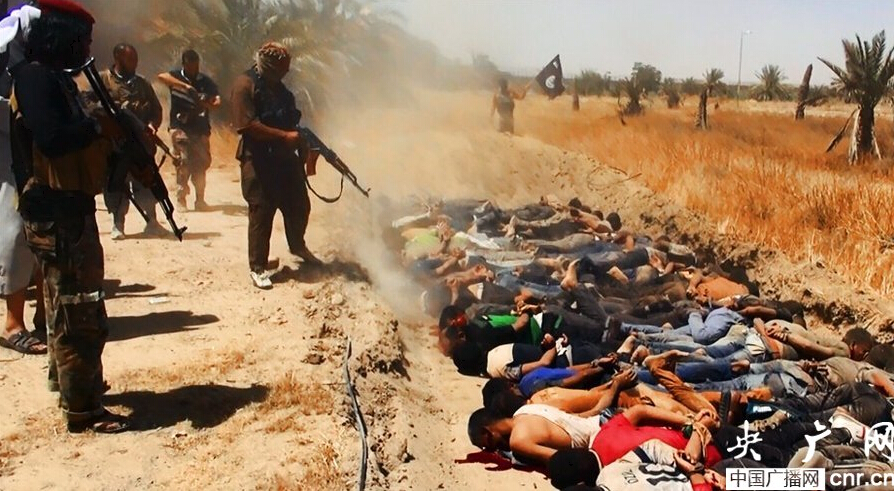 An image uploaded on June 14, 2014 on the jihadist website Welayat Salahuddin allegedly shows militants of the Islamic State of Iraq and the Levant (ISIL) executing dozens of captured Iraqi security forces members at an unknown location in the Salaheddin province. A major offensive spearheaded by ISIL but also involving supporters of executed dictator Saddam Hussein has overrun all of one province and chunks of three others since it was launched on June 9. [Photo/Cnr.cn] |