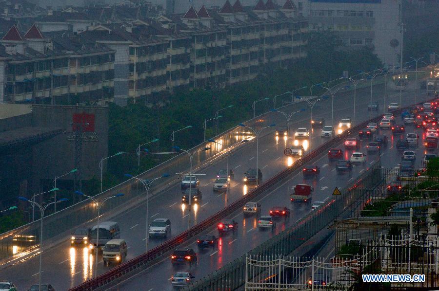 Motorcars run amid rainfall in Xiamen, southeast China's Fujian Province, June 16, 2014. The typhoon Hagibis brought torrential rain to Xiamen on Monday. (Xinhua/Jiang Kehong)