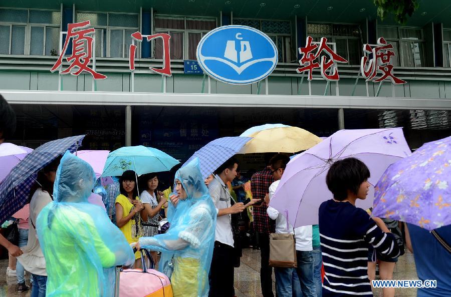 Tourists are trapped by rainstorm at a ferry port in Xiamen, southeast China's Fujian Province, June 16, 2014. The typhoon Hagibis brought torrential rain to Fujian on Monday. (Xinhua/Zhang Guojun)