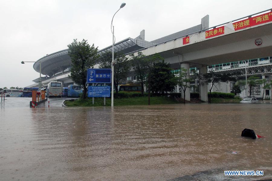Photo taken on June 16, 2014 shows a waterlogged street in Jimei District of Xiamen, southeast China's Fujian Province. Torrential rain hit Xiamen and four other cities in Fujian after typhoon Hagibis made its landfall in Shantou of the neighbouring Guangdong Province on Sunday night. (Xinhua/Zeng Demeng) |