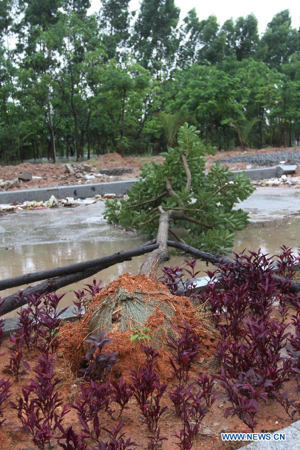 A tree lies uprooted on a flooded street in Jimei District of Xiamen, southeast China's Fujian Province, June 16, 2014. Torrential rain hit Xiamen and four other cities in Fujian after typhoon Hagibis made its landfall in Shantou of the neighbouring Guangdong Province on Sunday night. (Xinhua/Zeng Demeng) |