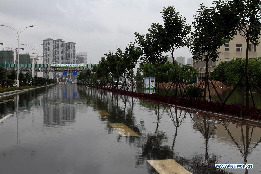 Photo taken on June 16, 2014 shows a waterlogged street in Jimei District of Xiamen, southeast China's Fujian Province. Torrential rain hit Xiamen and four other cities in Fujian after typhoon Hagibis made its landfall in Shantou of the neighbouring Guangdong Province on Sunday night. (Xinhua/Zeng Demeng) |