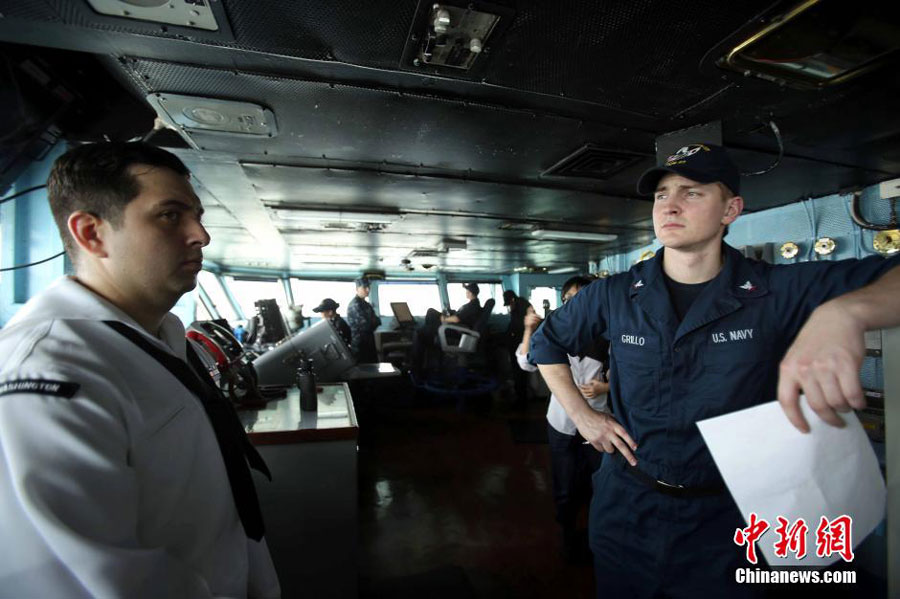 The US Navy's aircraft carrier USS George Washington docks in Hong Kong and welcomes four People's Liberation Army members for a VIP visit on Monday, June 16, 2014. [Photo: Chinanews.com]