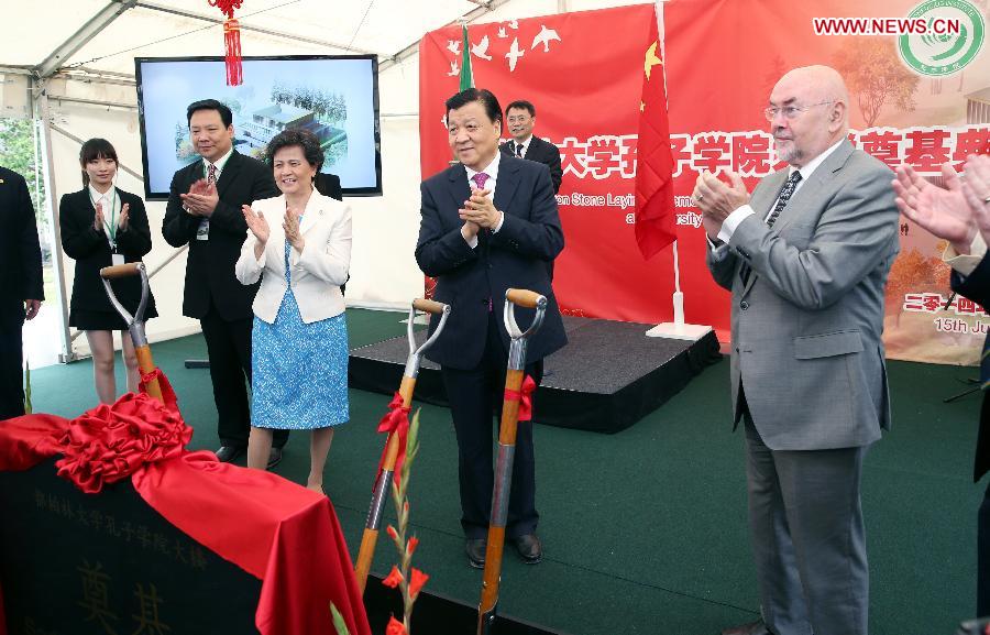 Liu Yunshan (2nd R, front), a member of the Standing Committee of the Political Bureau of the Central Committee of the Communist Party of China, attends the foundation stone laying ceremony for a new teaching building of the Confucius Institute at University College Dublin in Dublin, Ireland, June 15, 2014. (Xinhua/Yao Dawei) |