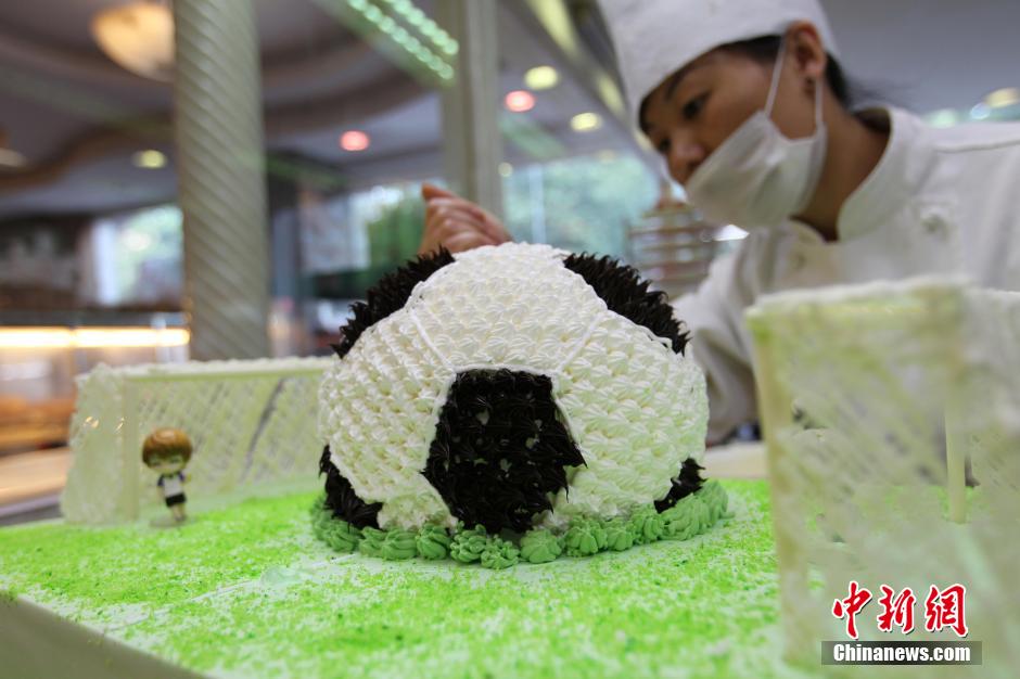 Cakes with the theme of the World Cup Football were sold at a store in east China's Jiangsu province. (China News Service/Xu Congjun)