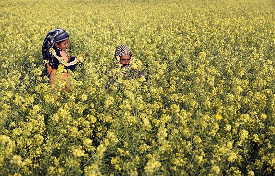 A father plays games with his daughter amid the rape flowers on March 20, 2014. (Xinhua/ AFP)