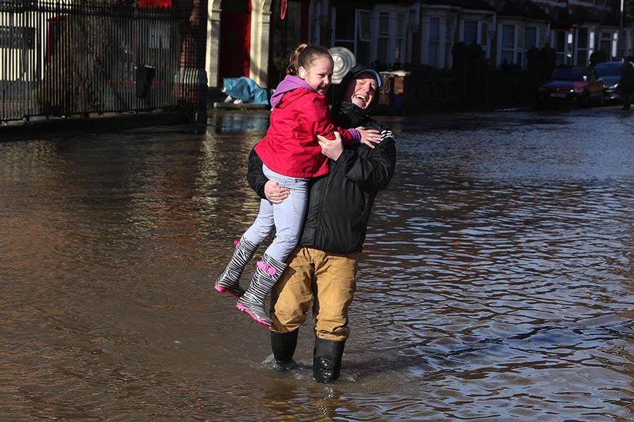 | A father holding his daughter in his arms walks through the flooded street in Worcester, United Kingdom on Feb. 13, 2014. (Xinhua/ AFP) |
