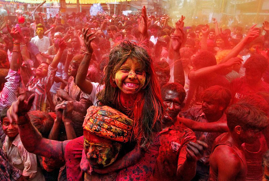 A girl sits on her father’s shoulder during the event. Revelers in India covered each other with colored powder and dance while taking part in Holi festival celebrations in Guwahati, March 17, 2014. (Xinhua/ RT)