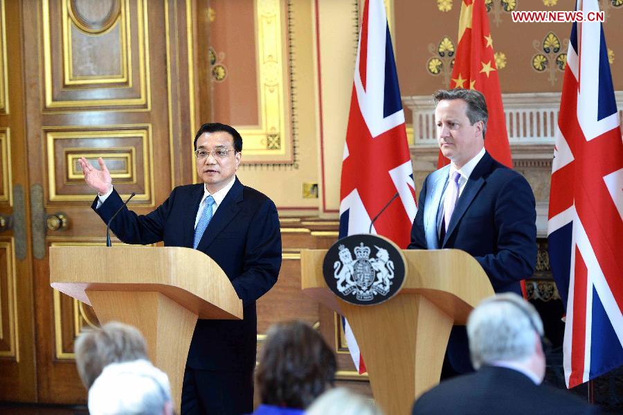 Chinese Premier Li Keqiang (L) and British Prime Minister David Cameron hold a joint press conference after their annual meeting in London, Britain, June 17, 2014. (Xinhua/Li Tao) |