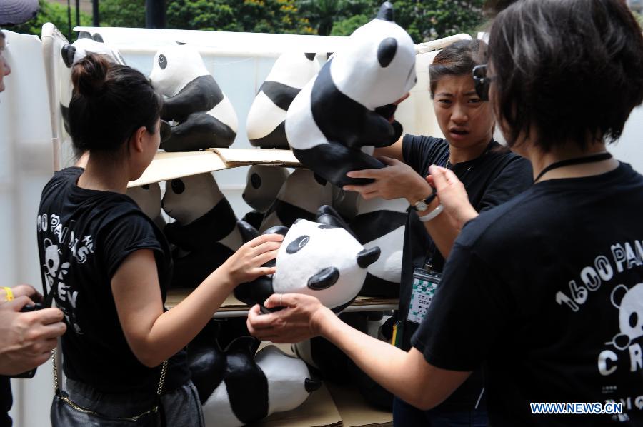 Staff members carry paper pandas to an exhibition at the Victoria Park, south China's Hong Kong, June 19, 2014. A total of 1,600 paper pandas were displayed here on June 19, which were the work of French artist Paulo Grangeon. (Xinhua/Lo Ping Fai)