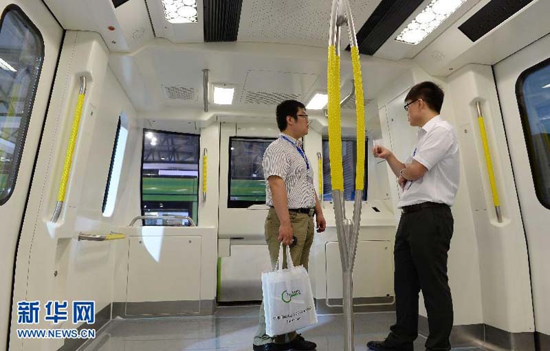 This picture shows the locomotive of the first driverless subway train at Rail+Metro China in Shanghai on June 17, 2014. It is said that this train with three carriages can carry 1,500 passengers at most. Having no cabin for the driver, the train looks like ordinary subway trains. Without the driver or stewards, this train automatically starts, departs from the station, goes uphill or downhill, stops in accurate alignment with the stations, opens and shuts the doors of carriages. (Xinhua/Lai Xinlin) |