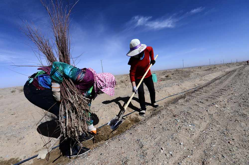 Two people plant rose willows in an industrial zone in the desert of Qinghai on May 20, 2014. (Xinhua/ Zhang Hongxiang)