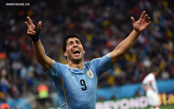 Uruguay's Luis Suarez celebrates for his goal during a Group D match between Uruguay and England of 2014 FIFA World Cup at the Arena de Sao Paulo Stadium in Sao Paulo, Brazil, June 19, 2014.Uruguay won 2-1 over England on Thursday.(Xinhua/Li Ga) |