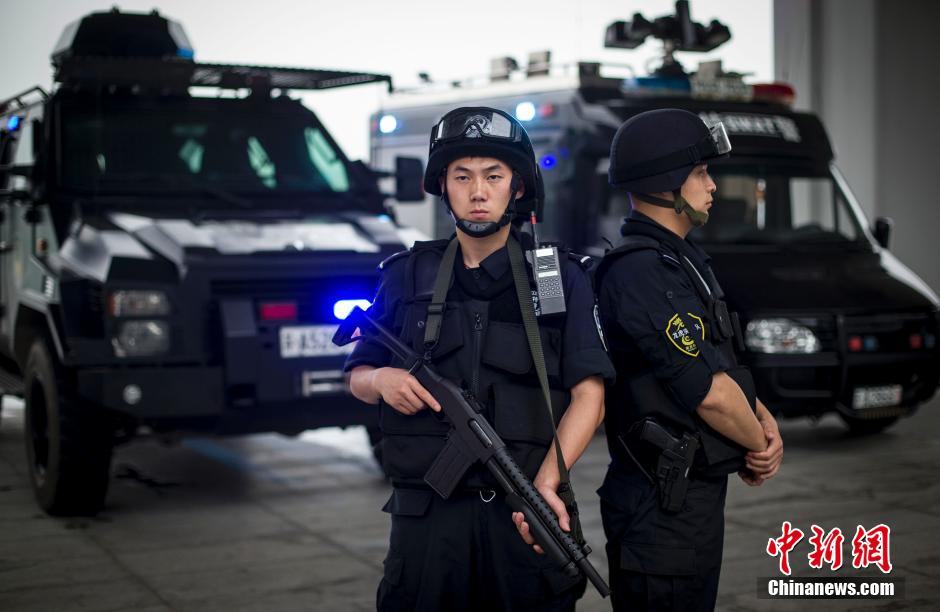 On June 18, Public Security Department of Jiangsu announced that the province will send 22,000 police officers to patrol 965 populated positions every day. They are equipped with 1,900 guns and 3,200 police cars. Armed patrol in Jiangsu began in March and has now been expanded to almost every city. The Police Tactical Unit (PTU) is equipped with armored vehicles, explosion-proof cars and assault vehicles. (CNS/Yang Bo) |