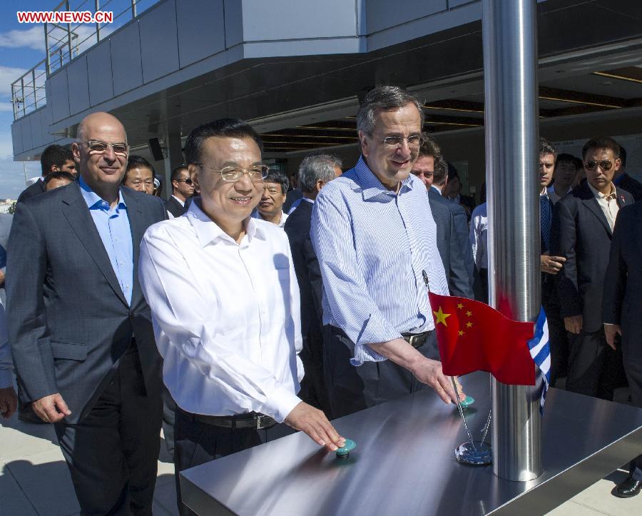 Chinese Premier Li Keqiang (C) and his Greek counterpart Antonis Samaras (R) launch a cargo train that carries Chinese goods and heads for Central and Eastern Europe during an inspection tour to the Piraeus Container Terminal (PCT) near Athens, capital of Greece, June 20, 2014. (Xinhua/Wang Ye) |