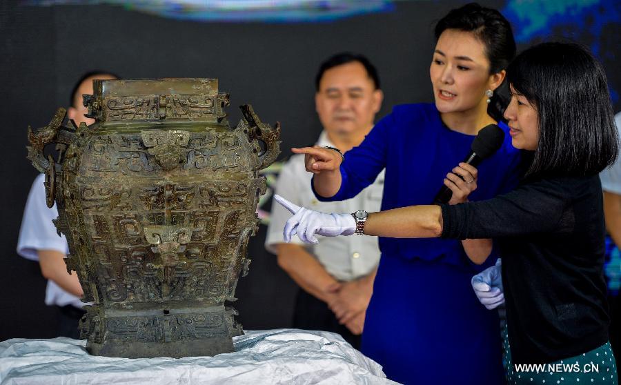 Staff members check the Min Fanglei at the Customs Supervised Warehouse of the airport of Changsha, capital of central China's Hunan Province, June 21, 2014. Lei was a kind of ritual vessel and wine container in the late Shang Dynasty (1600 BC-1046 BC) and early Zhou Dynasty (1046 BC - 771 BC) in China. The Min Fanglei, which got its name Min from the inscriptions on it, is the most exquisite and largest Lei ever unearthed. The body of Min Fanglei has been separated from its lid since its was unearthed in 1919 in Taoyuan County of Hunan. The famous bronzeware, which has been away from its home for almost a century, returned home Saturday after being purchased from an overseas owner in March. (Xinhua/Bai Yu) |
