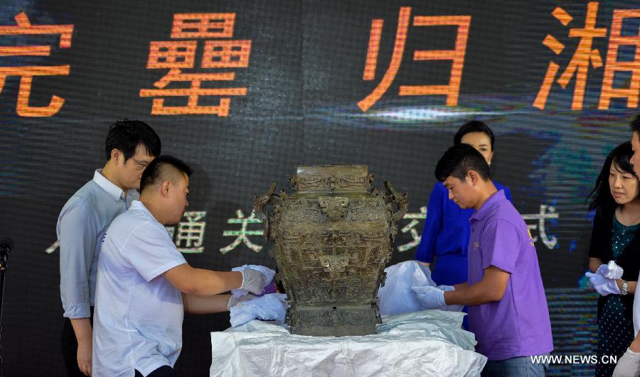 Staff members re-pack the Min Fanglei at the airport of Changsha, capital of central China's Hunan Province, June 21, 2014. Lei was a kind of ritual vessel and wine container in the late Shang Dynasty (1600 BC-1046 BC) and early Zhou Dynasty (1046 BC - 771 BC) in China. The Min Fanglei, which got its name Min from the inscriptions on it, is the most exquisite and largest Lei ever unearthed. The body of Min Fanglei has been separated from its lid since its was unearthed in 1919 in Taoyuan County of Hunan. The famous bronzeware, which has been away from its home for almost a century, returned home Saturday after being purchased from an overseas owner in March. (Xinhua/Bai Yu) |