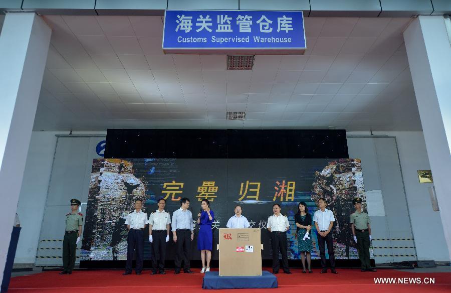 Staff members put the Min Fanglei in front of the door of the Customs Supervised Warehouse of the airport of Changsha, capital of central China's Hunan Province, June 21, 2014. Lei was a kind of ritual vessel and wine container in the late Shang Dynasty (1600 BC-1046 BC) and early Zhou Dynasty (1046 BC - 771 BC) in China. The Min Fanglei, which got its name Min from the inscriptions on it, is the most exquisite and largest Lei ever unearthed. The body of Min Fanglei has been separated from its lid since its was unearthed in 1919 in Taoyuan County of Hunan. The famous bronzeware, which has been away from its home for almost a century, returned home Saturday after being purchased from an overseas owner in March. (Xinhua/Bai Yu) |