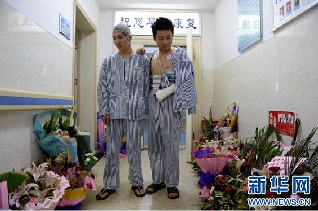Liu and Yi receive many bouquets from people who learn their stories from media. They helped each other walk out of the ward on June 16, 2014. (Xinhua/ Chen Zixia)