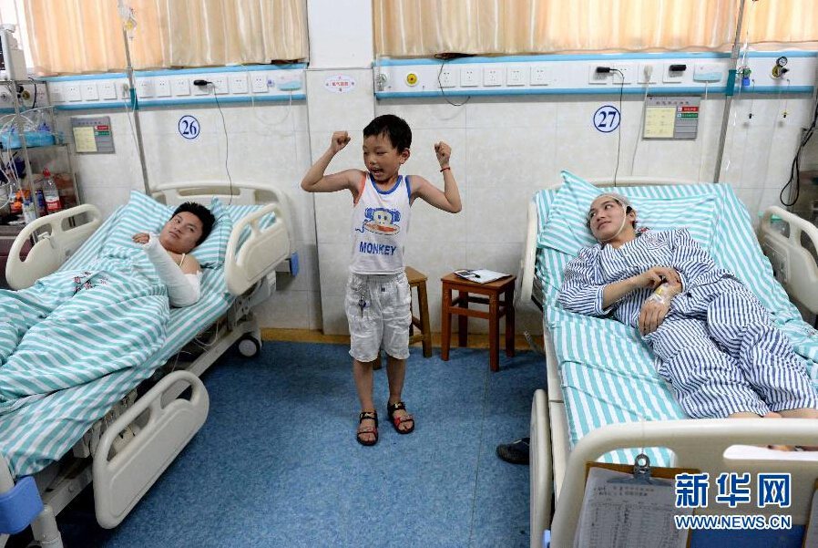 Long Chaoyu, 6, visits Liu and Yi in the wards on June 15, 2014. He became a fan of the two after he learnt their bravery on TV. (Photo/ Chen Zixia)