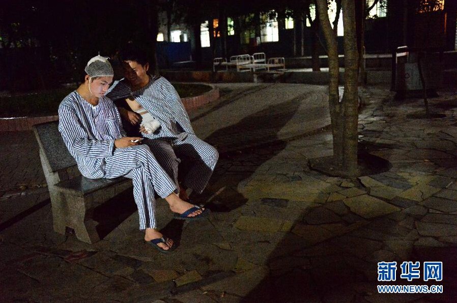 Liu Yanbing (L) and Yi Zhengyong go out of wards for some fresh air after dinner on June 16, 2014. (Xinhua/ Chen Zixia)