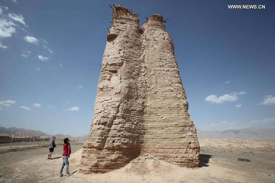 Photo taken on Aug. 29, 2013 shows the Kirzierduoha Beacon Fire Tower, northwest China's Xinjiang Uygur Autonomous Region. The famous ancient Silk Road, which served as a corridor for trade and cultural exchanges between Asia and Europe dating back to 2,000 years ago, was inscribed on the World Heritage list at Doha, capital of Qatar on June 22, 2014. Jointly submitted by China, Kazakhstan and Kyrgyzstan, the application for adding part of the millennium-old trade route to the UNESCO list was approved by the World Heritage Committee which convened its 38th session in Doha. (Xinhua) |