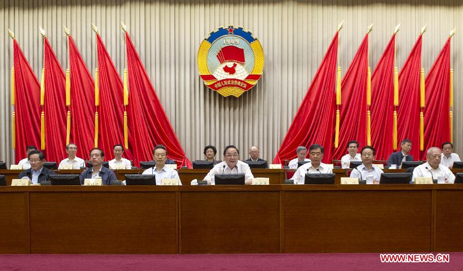 Yu Zhengsheng (C front), chairman of the National Committee of the Chinese People's Political Consultative Conference (CPPCC), presides over the opening meeting of the 6th conference of the Standing Committee of the 12th CPPCC National Committee in Beijing, China, June 23, 2014. (Xinhua/Xie Huanchi)