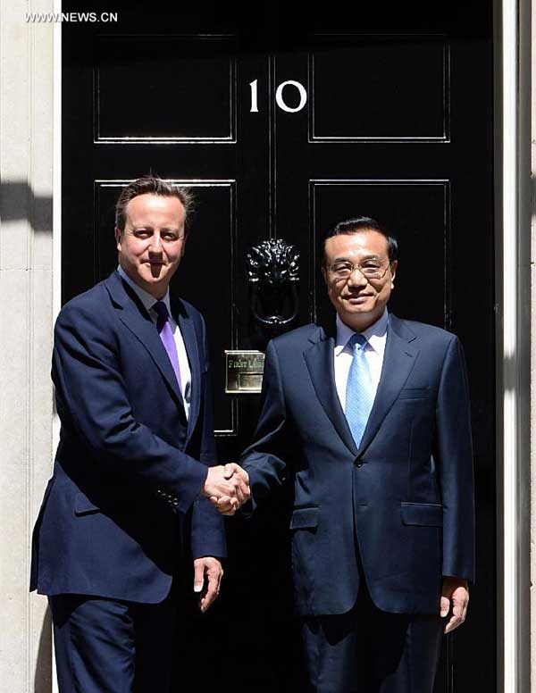Chinese Premier Li Keqiang (R) shakes hands with British Prime Minister David Cameron during their annual meeting in London, Britain, June 17, 2014. (Xinhua/Li Tao) |