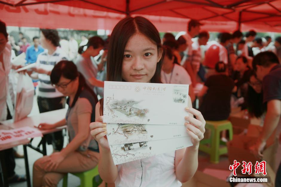 In celebration of the Grand Canal's inclusion on the World Heritage list, a ceremony for the issuance of a series of stamps and commemorative envelopes with ten scenes of the Grand Canal drawn by famous artists is held in Hangzhou, east China's Zhejiang Province, June 23, 2014. Each set is composed of three envelopes with the words "China's Grand Canal has been inscribed on the World Heritage List". At most 20,000 sets will be issued in Zhejiang Province. (Chinanews.com/Li Chenyun) |