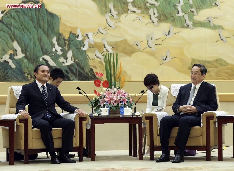 Yu Zhengsheng (R), chairman of the National Committee of the Chinese People's Political Consultative Conference, meets with a delegation from Japanese Social Democratic Party, which is led by party head Tadatomo Yoshida, in Beijing, China, June 24, 2014. (Xinhua/Ding Lin) |