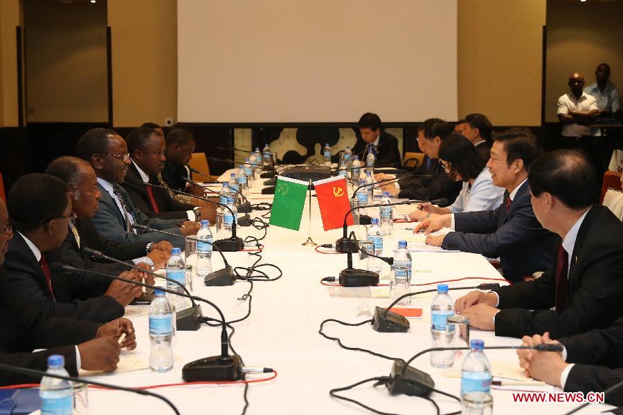 Visiting Chinese Vice President Li Yuanchao (2nd R) meets with Philip Mangula (3rd L), the Vice Chairman of the Revolutionary Party of Tanzania, in Dar es Salaam, Tanzania, June 24, 2014. (Xinhua/Zhang Ping)