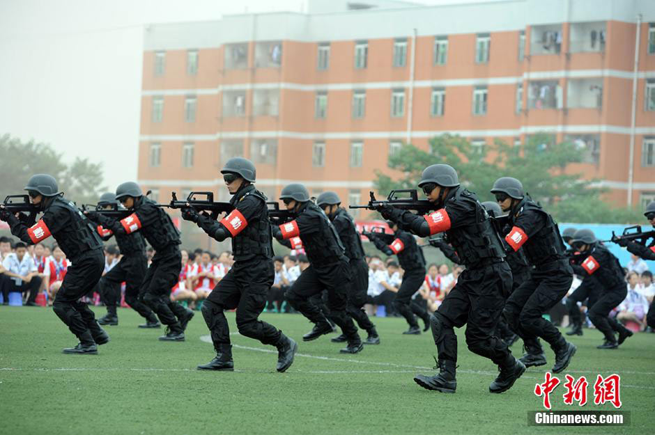 China's first college anti-terrorism and riot squad conducts a drill on the campus of Chengdu East Star Airlines Travel College on June 20. The police officers of the Chengdu Municipal Public Security Bureau will give the squad members two-month-long rigorous training which include physical training and tactical drills. (Chinanews.com/Zhong Xin)