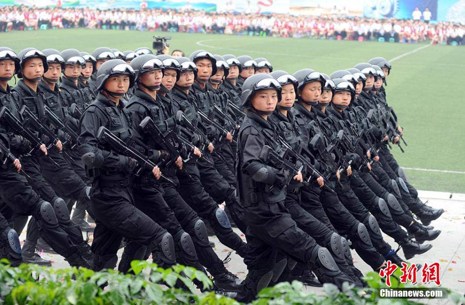 China's first college anti-terrorism and riot squad conducts a drill on the campus of Chengdu East Star Airlines Travel College on June 20. The police officers of the Chengdu Municipal Public Security Bureau will give the squad members two-month-long rigorous training which include physical training and tactical drills. (Chinanews.com/Zhong Xin)