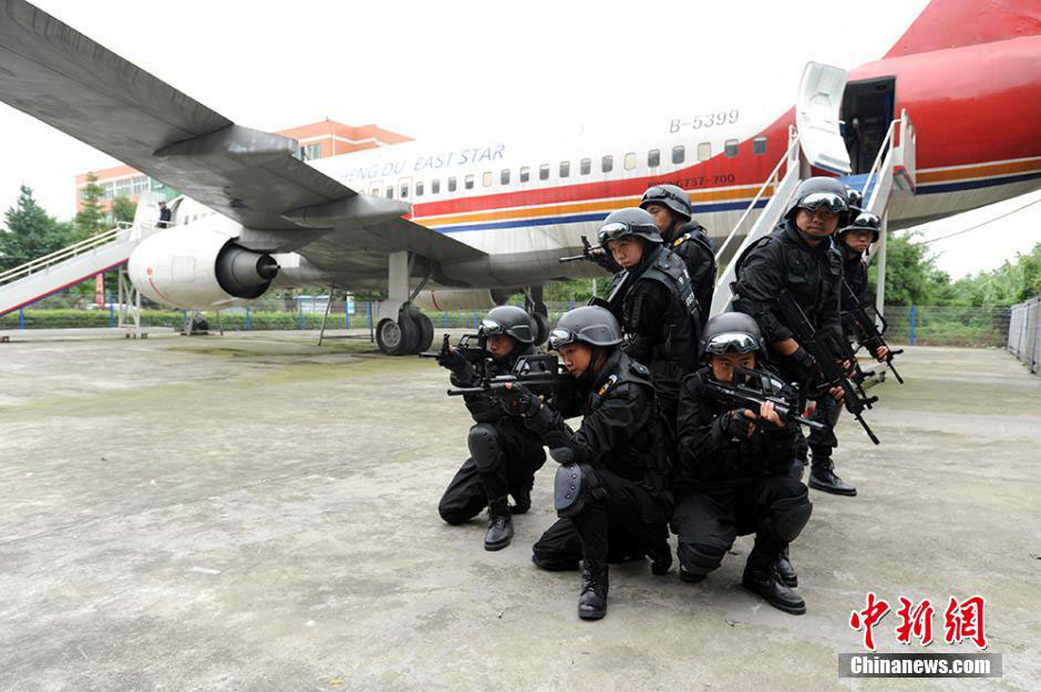 China's first college anti-terrorism and riot squad conducts a drill on the campus of Chengdu East Star Airlines Travel College on June 20. The police officers of the Chengdu Municipal Public Security Bureau will give the squad members two-month-long rigorous training which include physical training and tactical drills. (Chinanews.com/Zhong Xin) |
