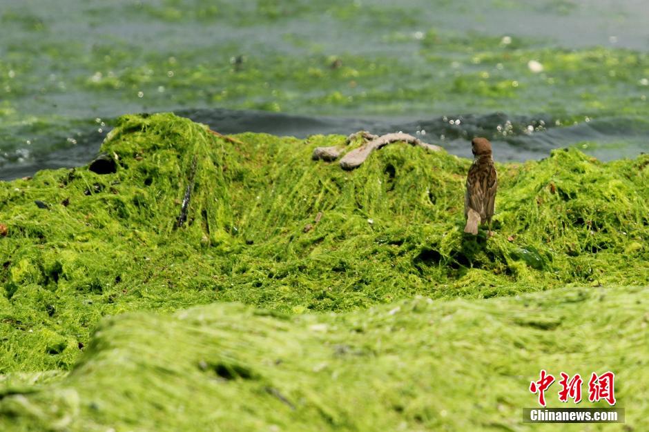 On June 23, large quantities of green algae known as enteromorpha profiera hit the coast of Qingdao, eastern China’s Shandong Province. This is the seventh year since 2008 that green algae have sprouted here. At present, operations are being carried out to remove the green algae. (CNSPHOTO)