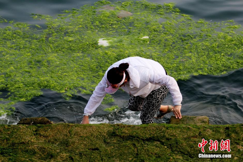 On June 23, large quantities of green algae known as enteromorpha profiera hit the coast of Qingdao, eastern China’s Shandong Province. This is the seventh year since 2008 that green algae have sprouted here. At present, operations are being carried out to remove the green algae. (CNSPHOTO)