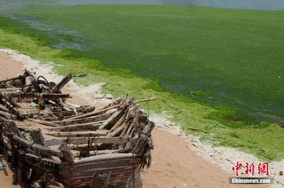 On June 23, large quantities of green algae known as enteromorpha profiera hit the coast of Qingdao, eastern China’s Shandong Province. This is the seventh year since 2008 that green algae have sprouted here. At present, operations are being carried out to remove the green algae. (CNSPHOTO)