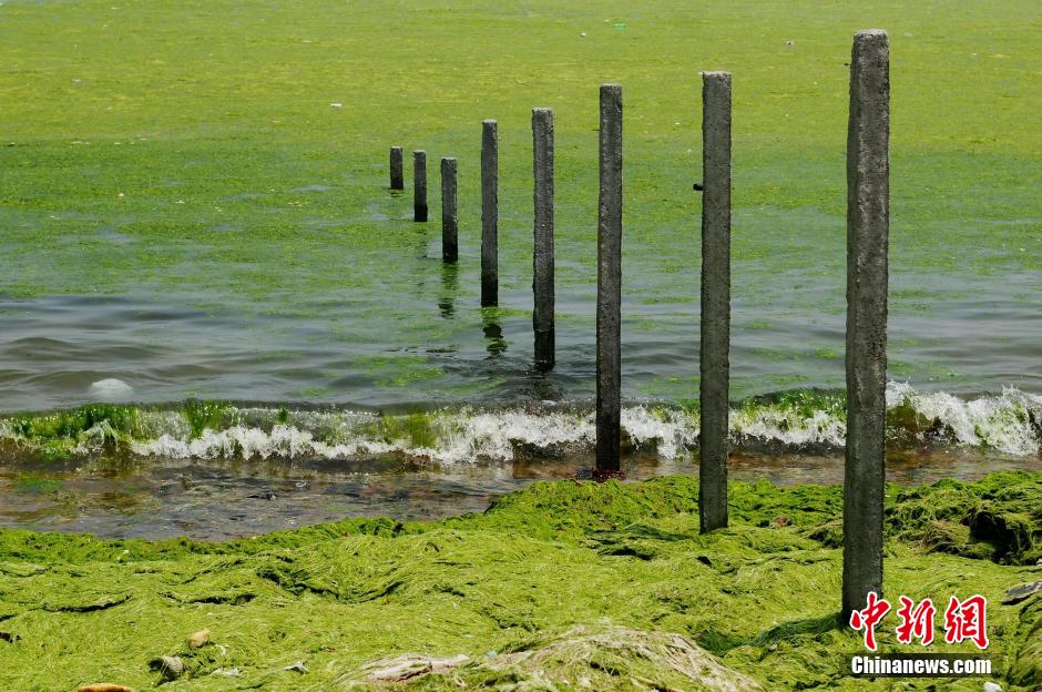 On June 23, large quantities of green algae known as enteromorpha profiera hit the coast of Qingdao, eastern China’s Shandong Province. This is the seventh year since 2008 that green algae have sprouted here. At present, operations are being carried out to remove the green algae. (CNSPHOTO) |