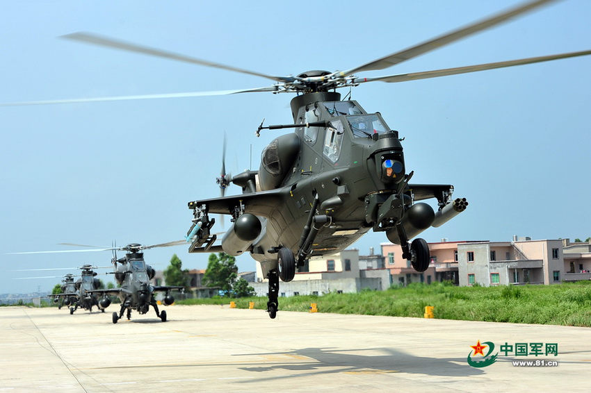A flight formation of attack helicopters which are loaded with air-to air missiles cruise during the flight training in Nanjing on June 19, 2014. (Photo/ Xiao Qingming)