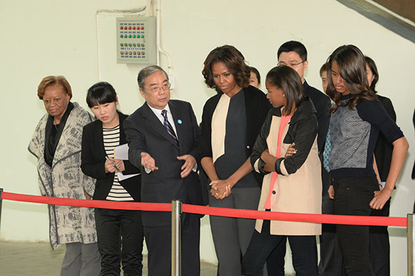 US first lady Michelle Obama and daughters Sasha and Malia look at the Terracotta Warriors in China's central Shaanxi province of Xian.