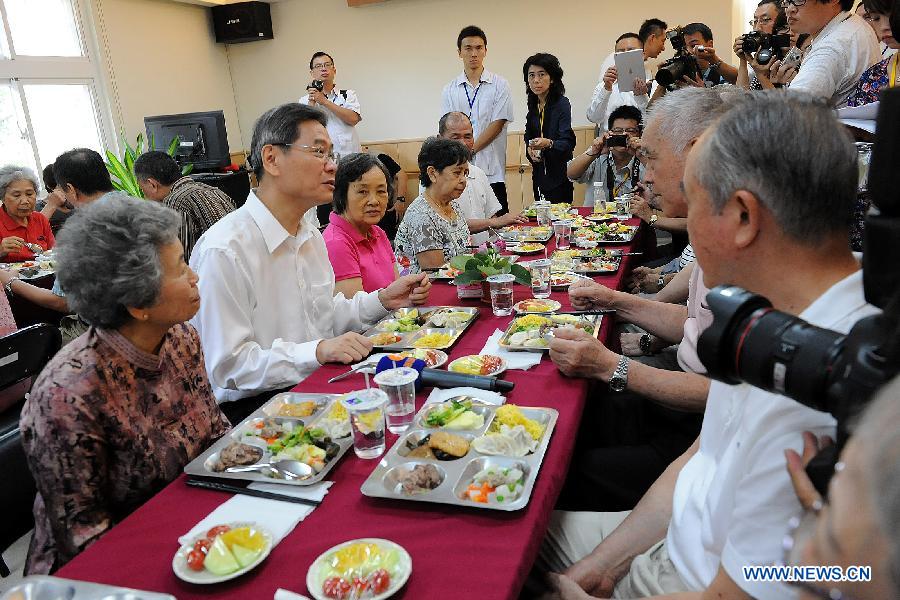 Zhang Zhijun (2nd L), director of the Taiwan Affairs Office of China's State Council, has lunch with senior citizens at a geracomium in Tucheng District of New Taipei City, southeast China's Taiwan, June 26, 2014. Zhang visited the geracomium on Thursday.(Xinhua/He Junchang) |