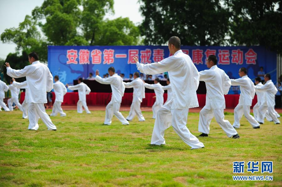 Recovering addicts perform Taiji in a compulsory rehabilitation center in Xuancheng, central China's Anhui province, June 24, 2014. (Xinhua/Du Yu)