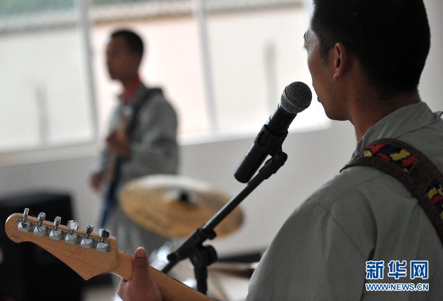 Recovering addicts play guitar in a compulsory rehabilitation center in Dali, southwest China's Yunnan Province, June 23, 2014. (Xinhua/Lin Yiguang)