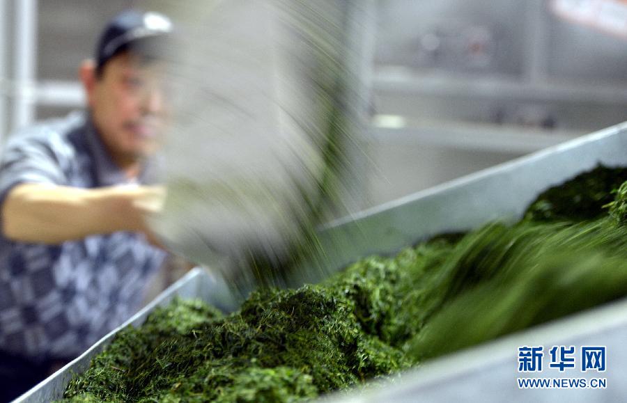 Rolled leaves are sent to the next processing line. The photo was taken on April 23, 2014. (Photo/Xinhua)