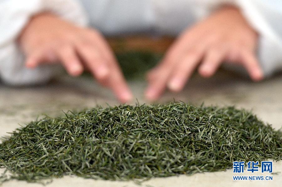 A worker examines tea leaves before packing. The photo was taken on April 23, 2014. (Photo/Xinhua)