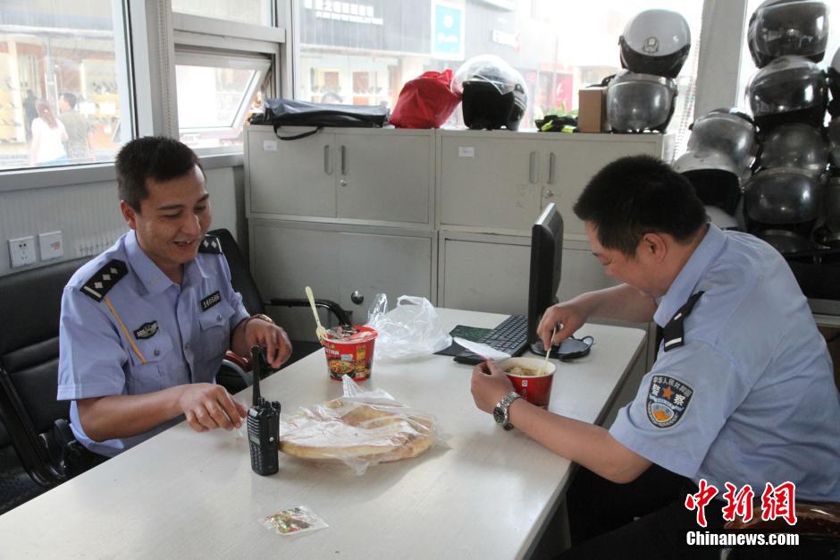 Weili and Wei Jie have some food during their short break. “We don’t have much time to take rest and take care of our families,“ they said. “Rest is not included in the dictionary for the police.” (CNS/ Xiao Xin)