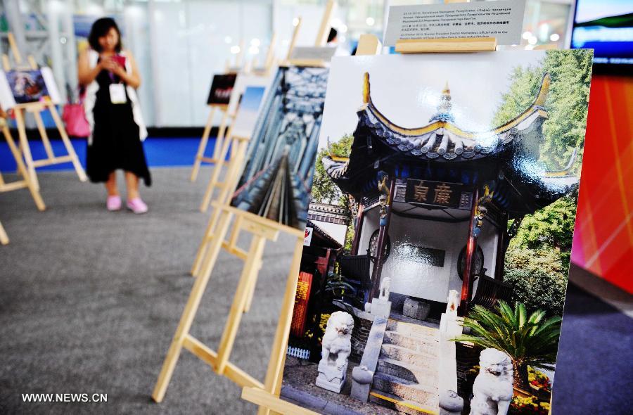 Photo taken by Russian Prime Minister Dmitry Medvedev are shown on display at the China-Russia Expo (CR Expo) in Harbin, capital of northeast China's Heilongjiang Province, June 30, 2014. The expo, which kicked off on June 30, will last until July 4. (Xinhua/Wang Jianwei)