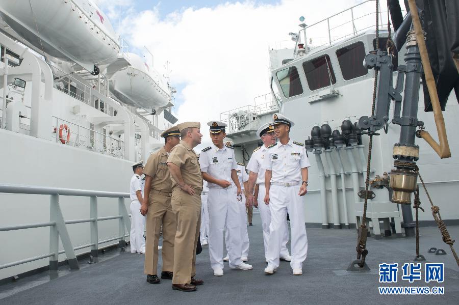 U.S. Vice Adm. Kenneth Floyd (front left), commander of the U.S. Third Fleet, visits PLA Navy supply ship Qiandaohu in Hawaii on June 28, 2014. (Photo/Xinhua)