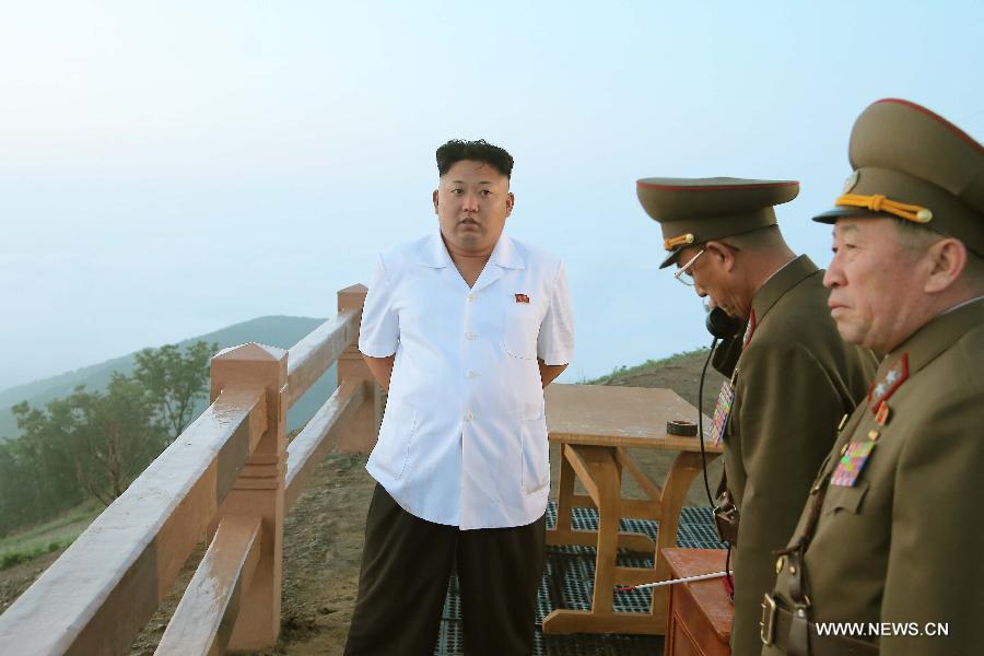 Photo provided by DPRK's official news agency KCNA on June 30, 2014 shows top leader of the Democratic People's Republic of Korea (DPRK) Kim Jong Un overseeing a tactical rocket firing drill of the DPRK military. The DPRK has launched precision guided missiles and fired shells with dispersion effect for striking both individual and group targets of the enemy in the drill, said the KCNA. (Xinhua/KCNA)